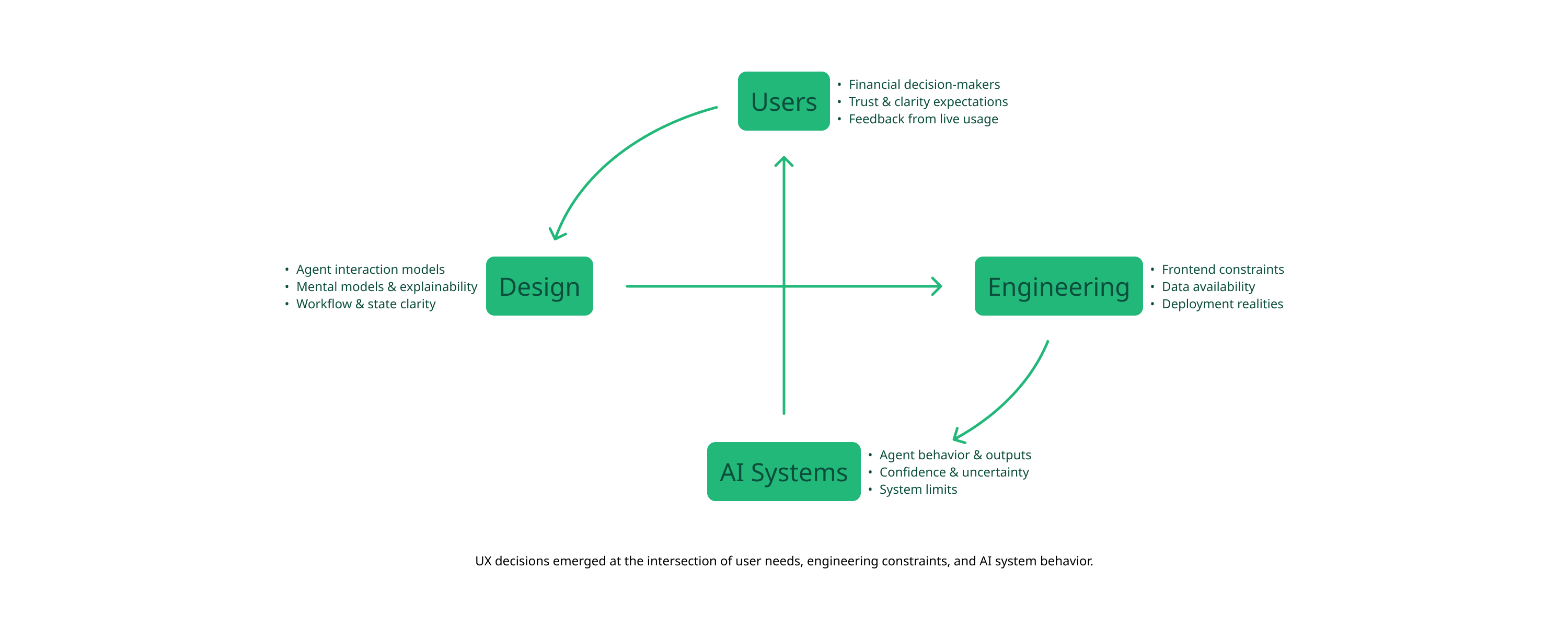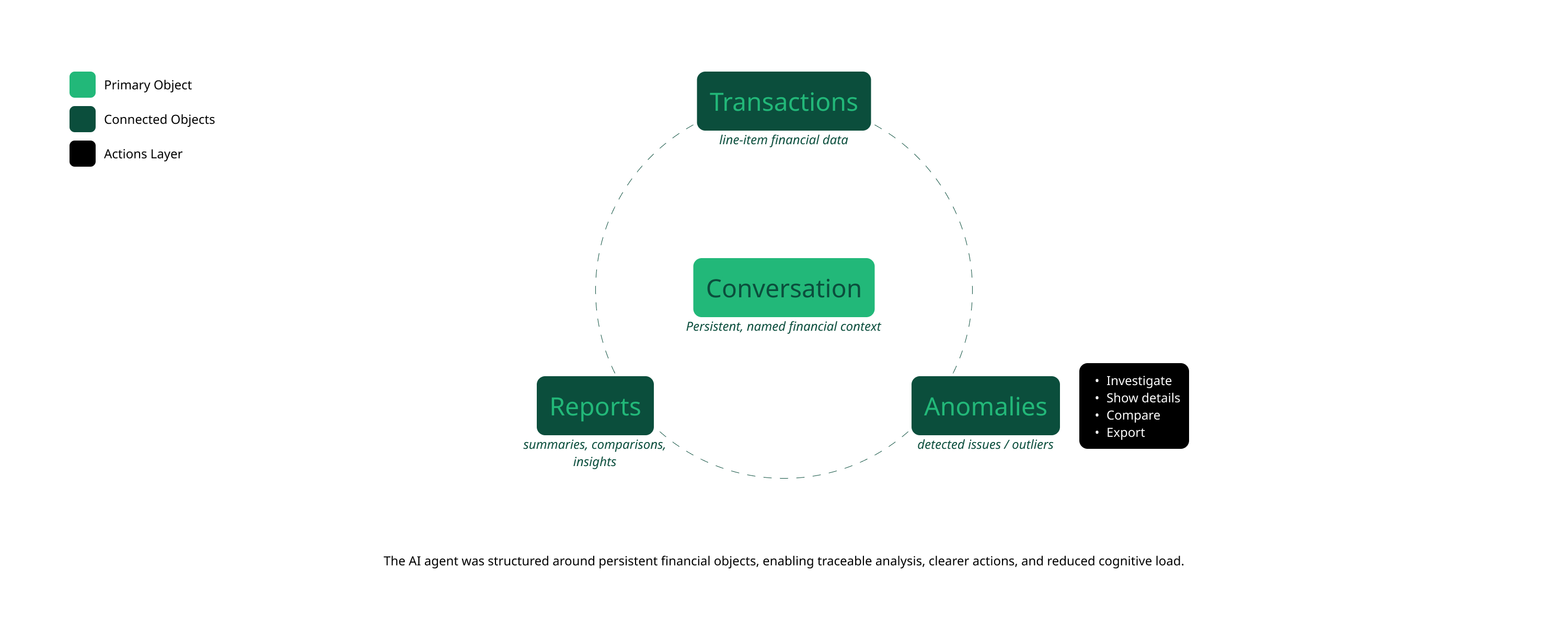 To reduce "hallucination anxiety," I applied Object-Oriented UX (OOUX). I worked with engineers to ensure the LLM and the UI shared a unified mental model of financial objects.
