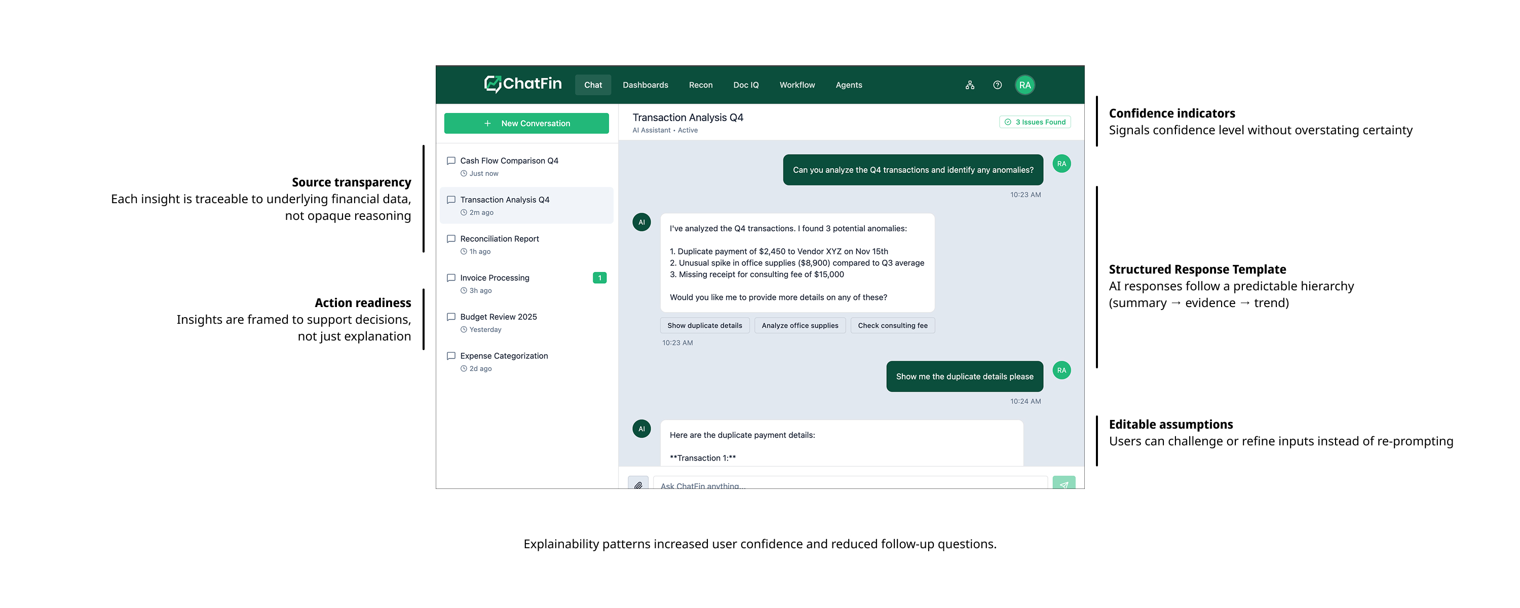 For a financial agent, "accuracy" isn't enough; "provenance" is the goal. I designed specific Explainability Patterns to build user trust: