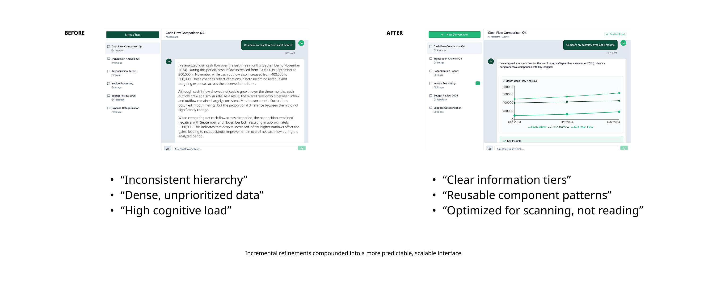 • Immediate Hierarchy: Primary insights (Runway, Burn Rate) moved to the top of the chat node.