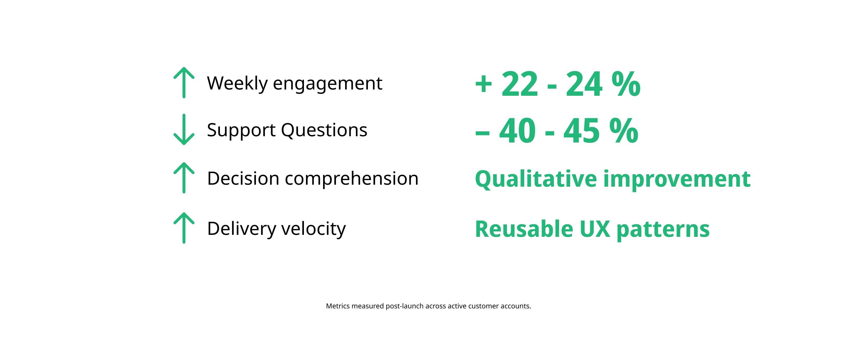 • -45% Support Volume: Clearer data provenance and "Show Reasoning" patterns reduced help desk escalations.