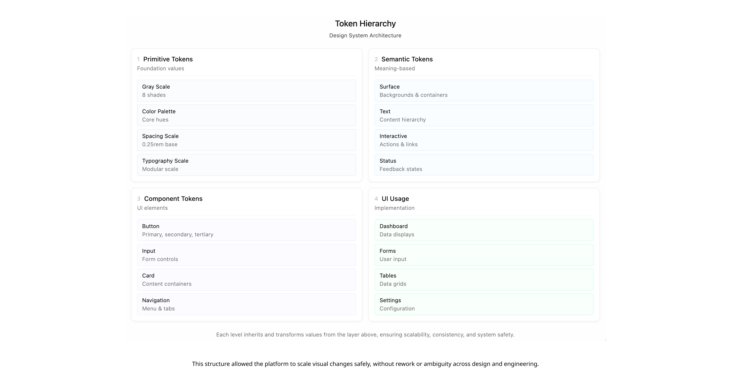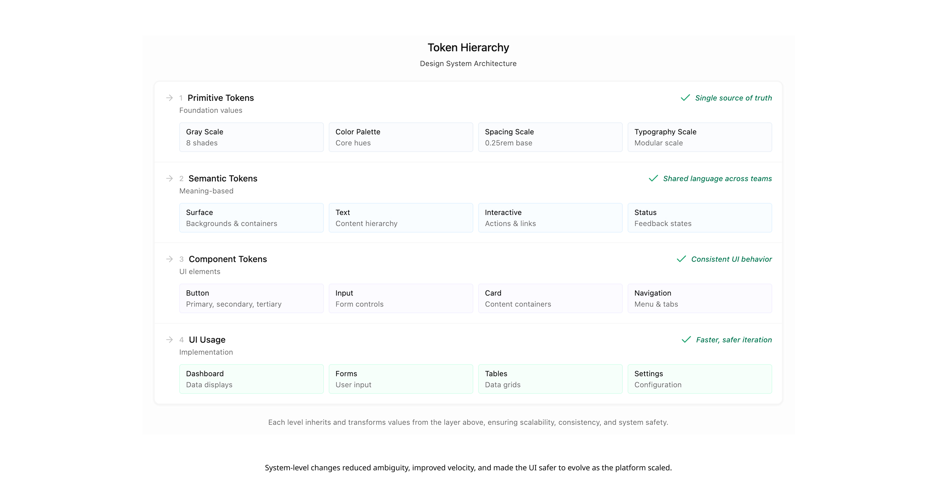 • Semantic Tokens: I introduced a token-based system (Surface, Component, State) that moved the conversation from "What color is this?" to "What is this color’s purpose?"