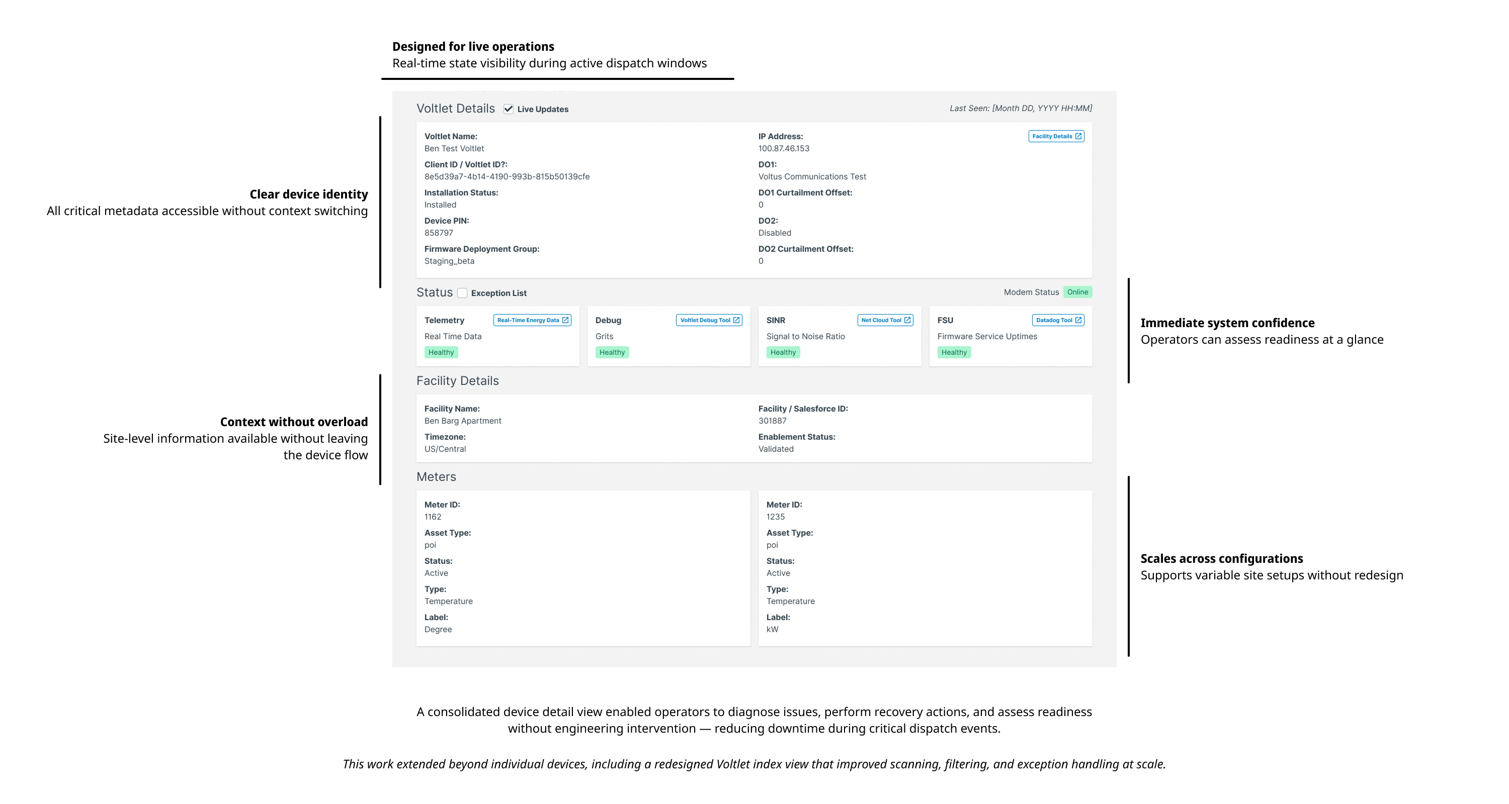Voltus operates a complex energy platform used by internal teams to monitor load, manage hardware, and report environmental impact — all under time-sensitive, revenue-critical conditions.